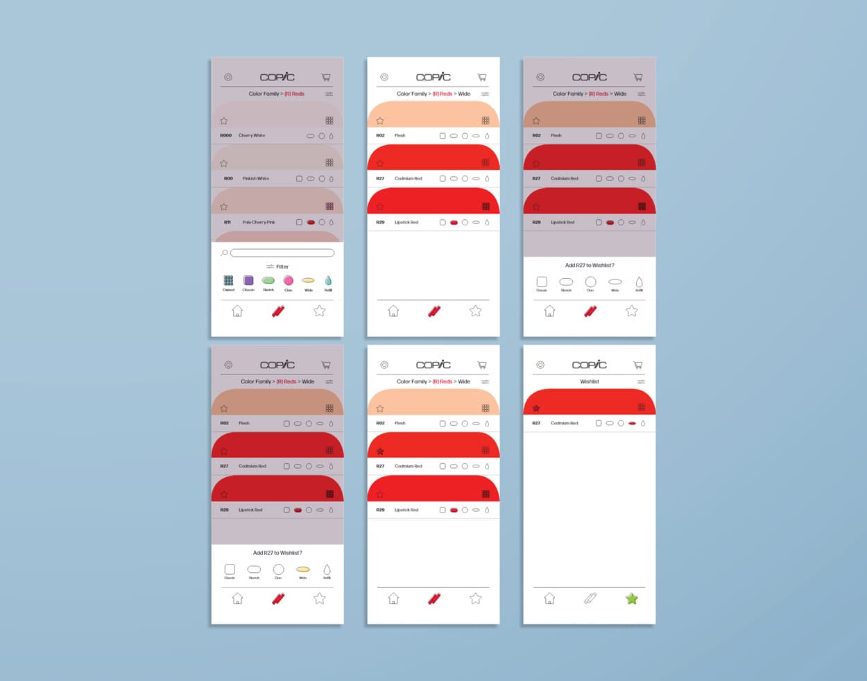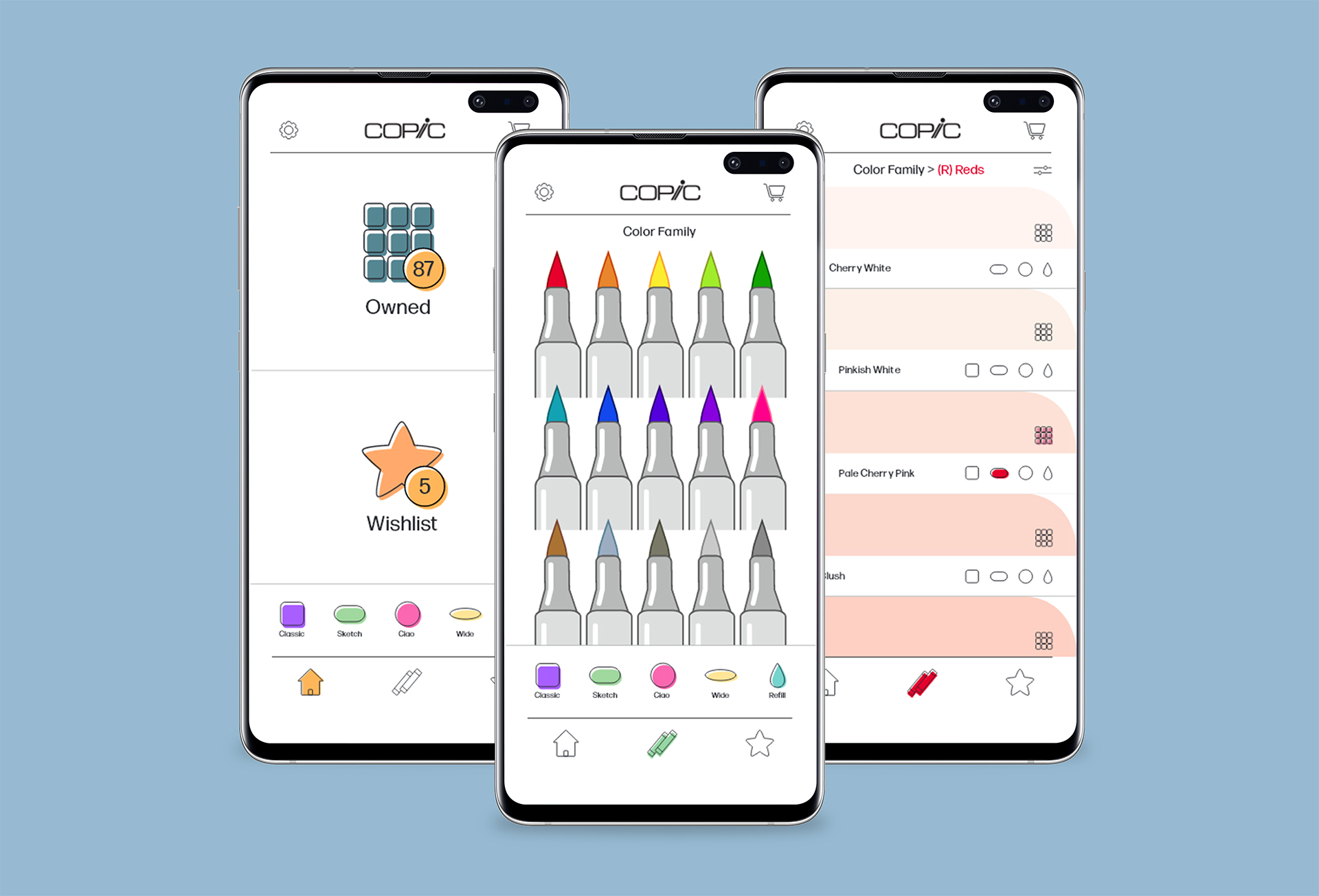 With 358 colors for their alcohol based markers in 4 different nib styles and refills, Copic needed an app for their users to keep track of their extensive collections. Focusing on visuals and colors, users can easily add and change their collections virtually and make their shopping lists for when they go buy more markers.