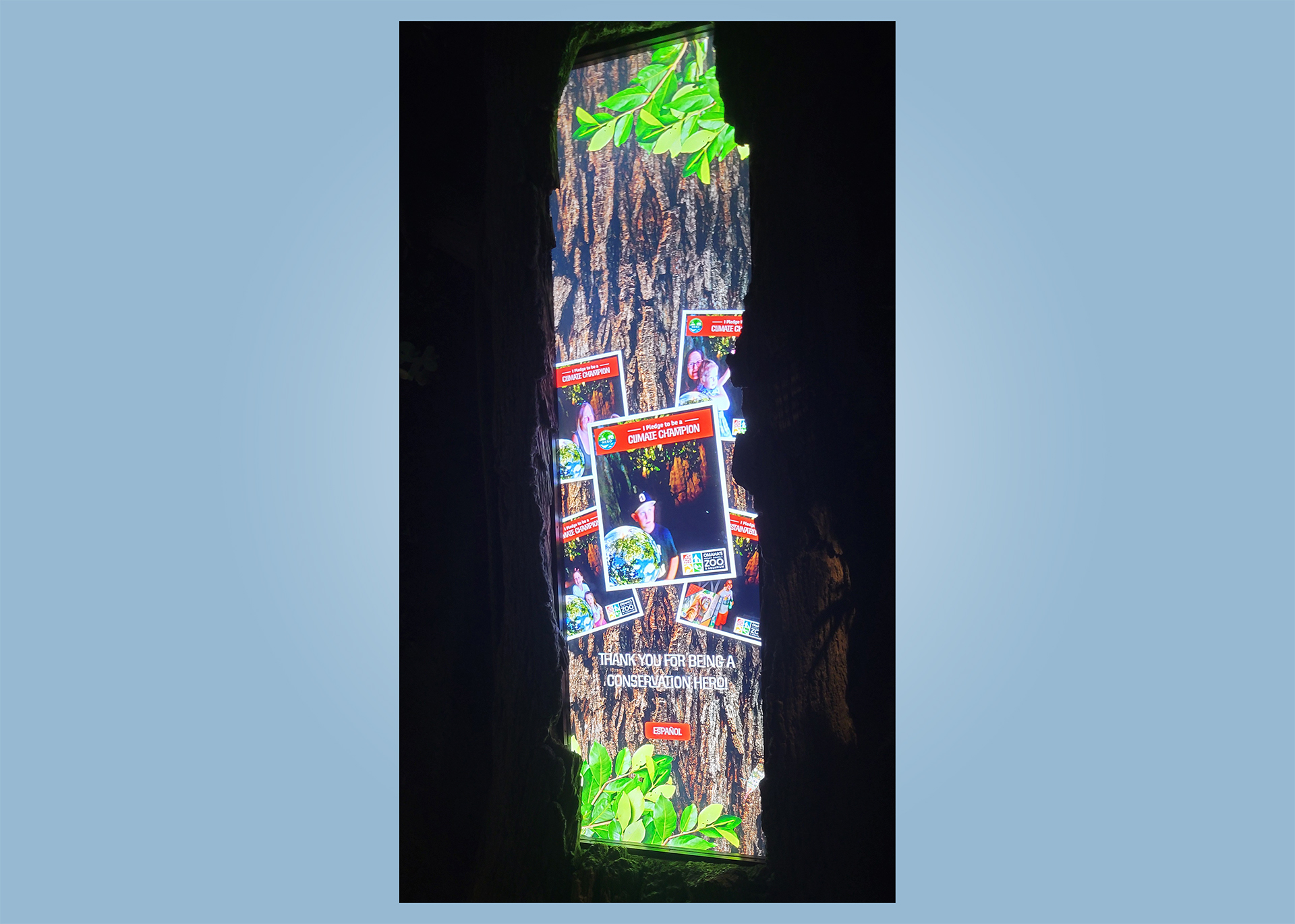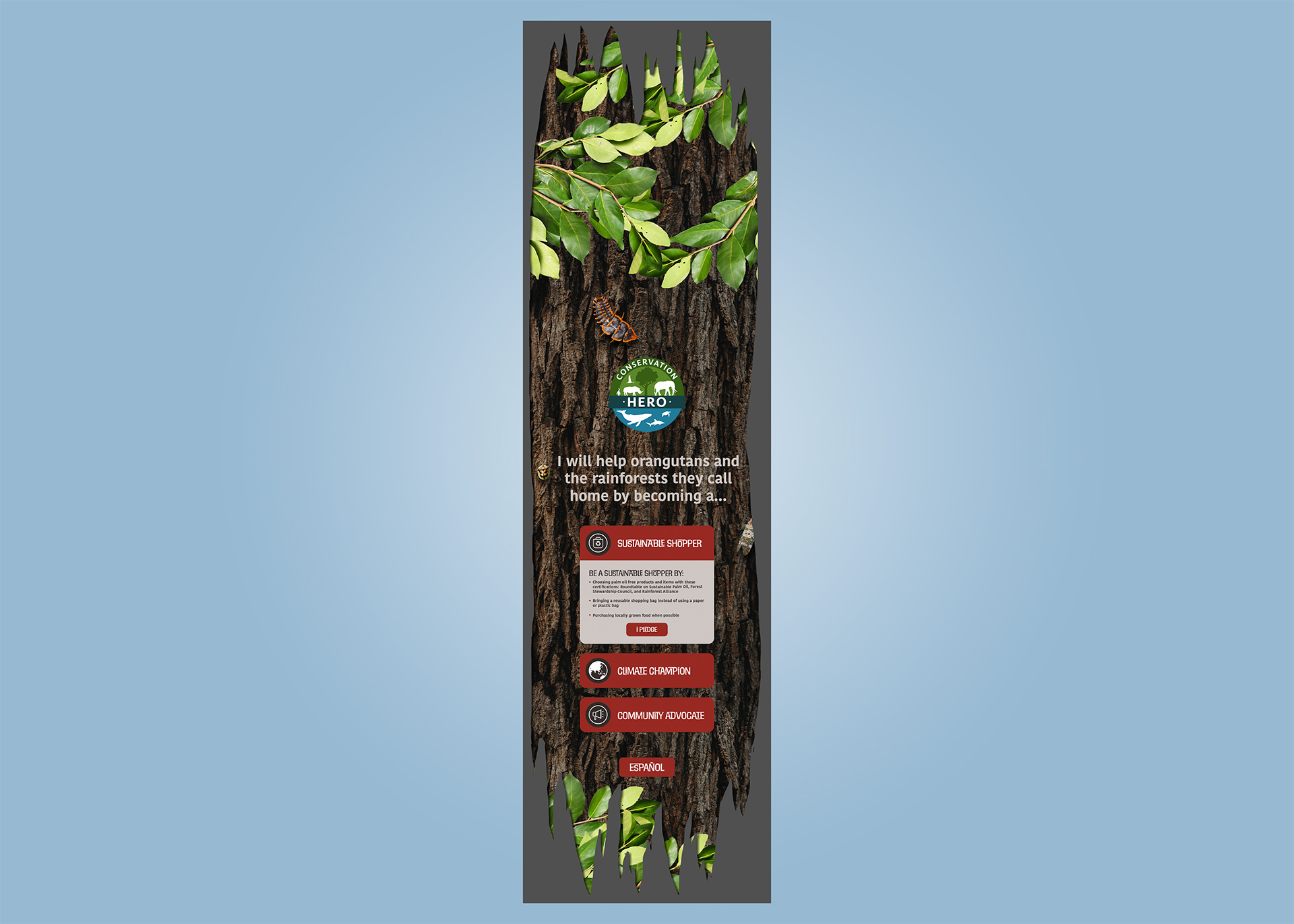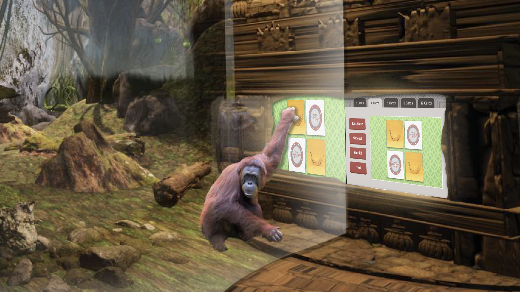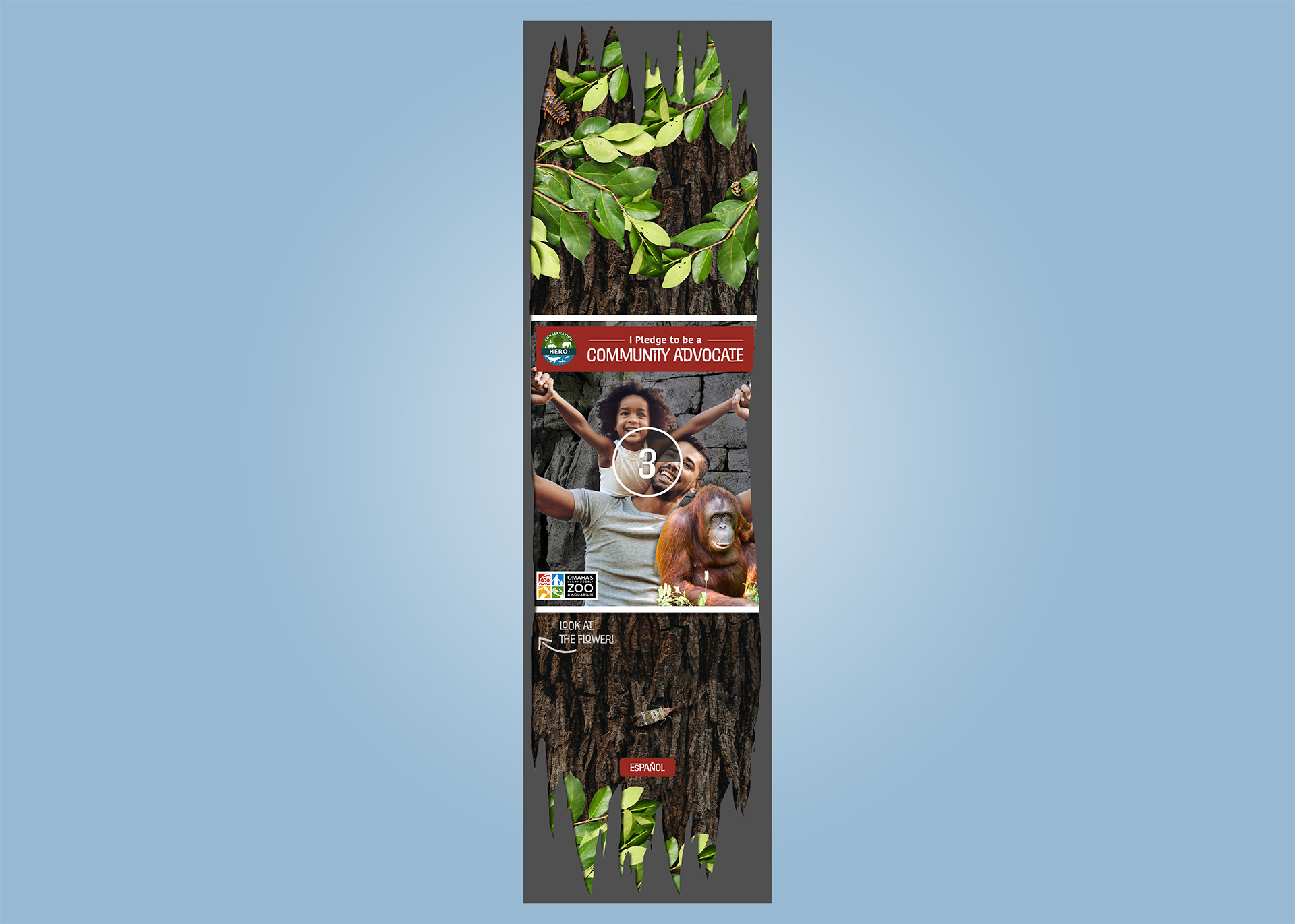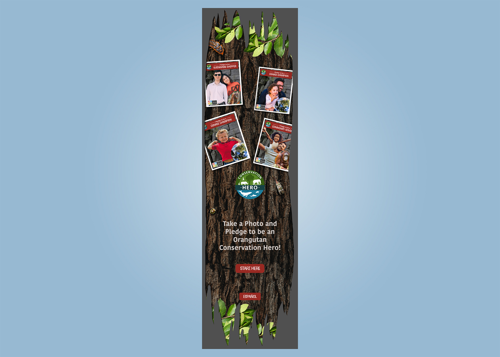 Omaha Henry Doorly Zoo wanted digital experiences that would highlight their orangutans' intelligence to zoo visitors, promote daily conservation efforts, and enrich the orangutans daily life. Working with the physical design and branding provided by Omaha Henry Doorly Zoo, a Pledge Photobooth that gives visitors a fun digital keepsake while promoting individual conservation efforts, a memory game and dual coloring page for training and special donor events, and an interactive leaf pile projection were created.